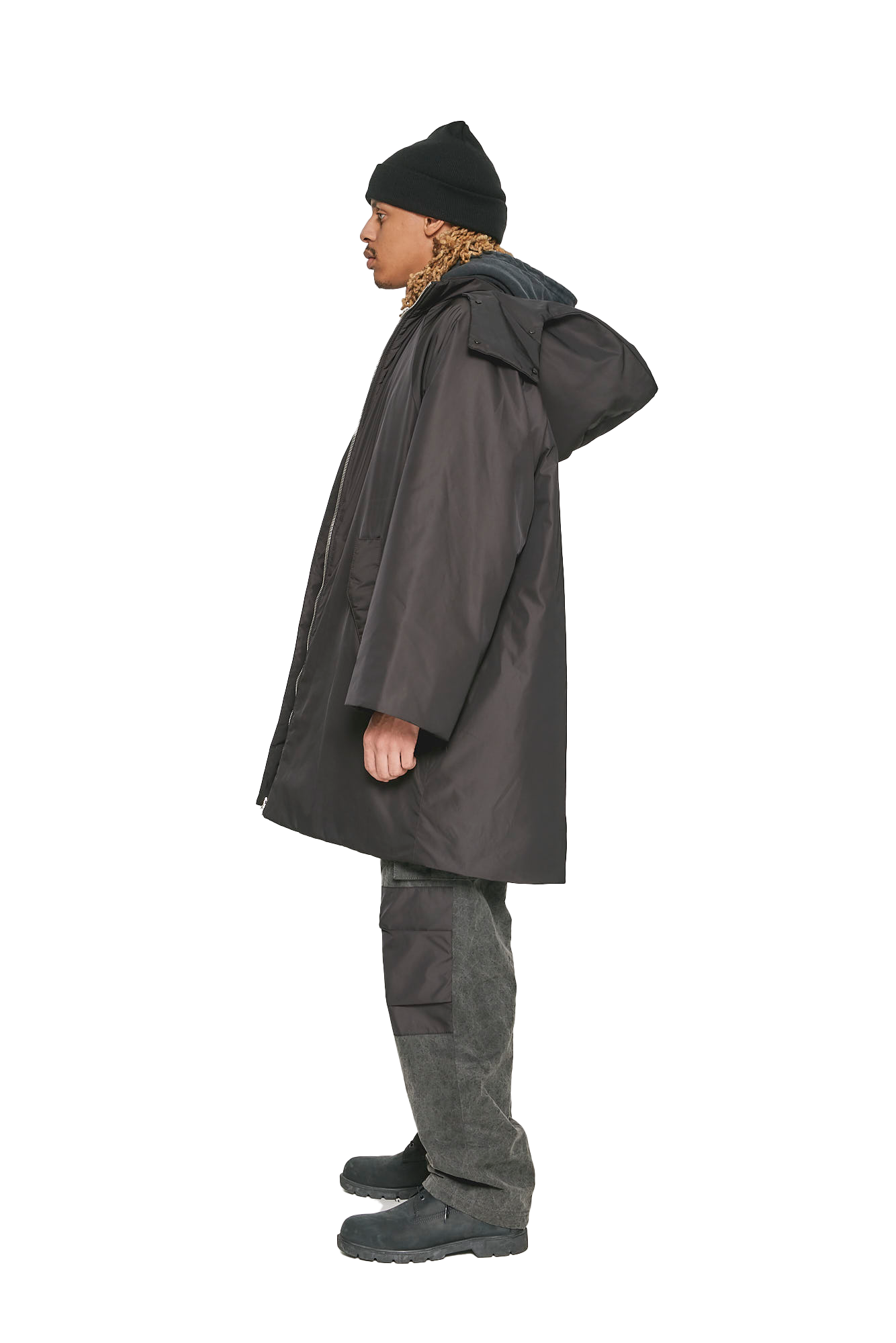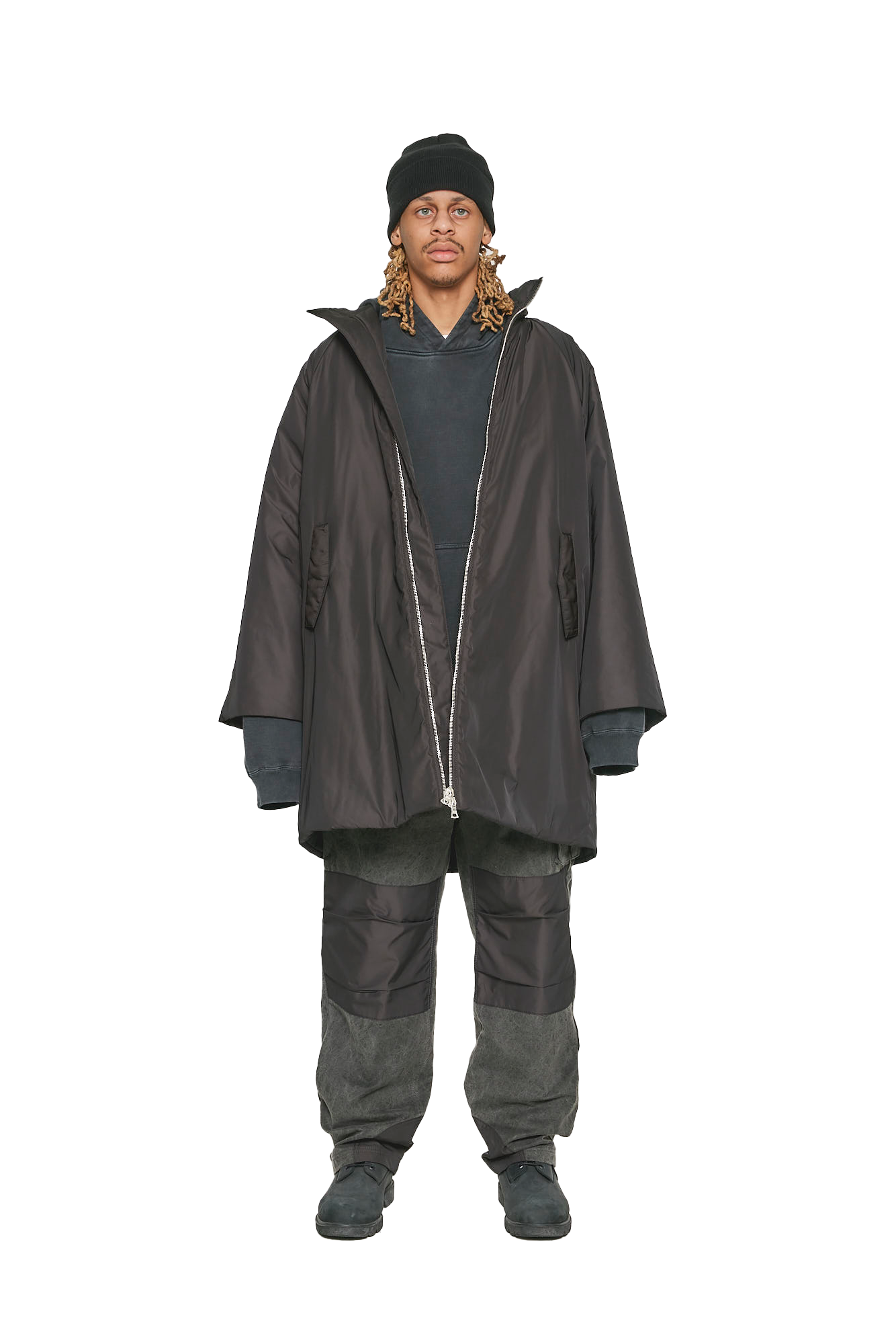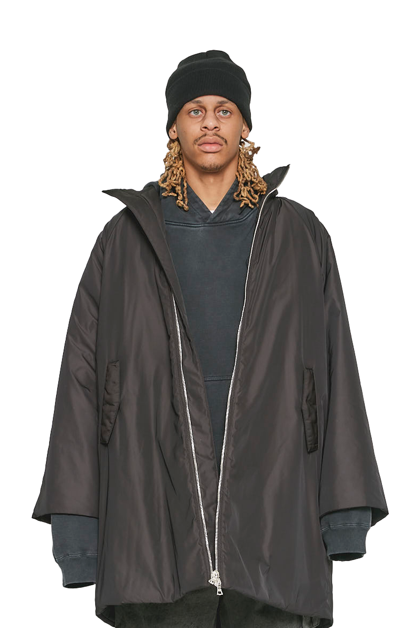 Oversized coat with exaggerated hood features RiRi zippers and kimono sleeves.