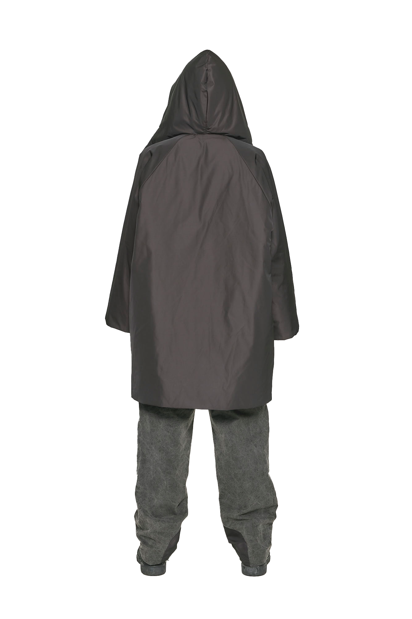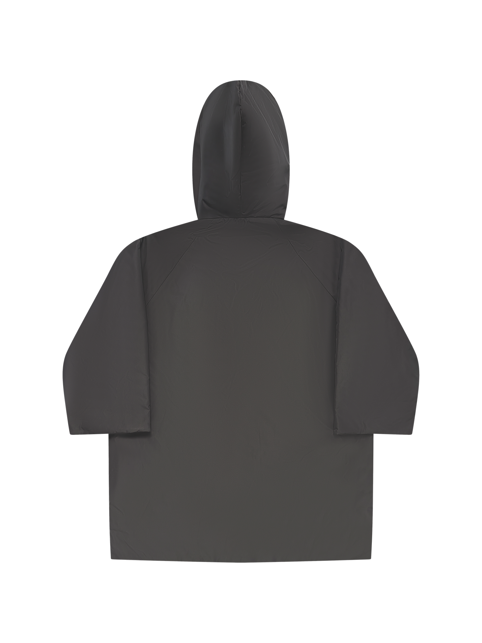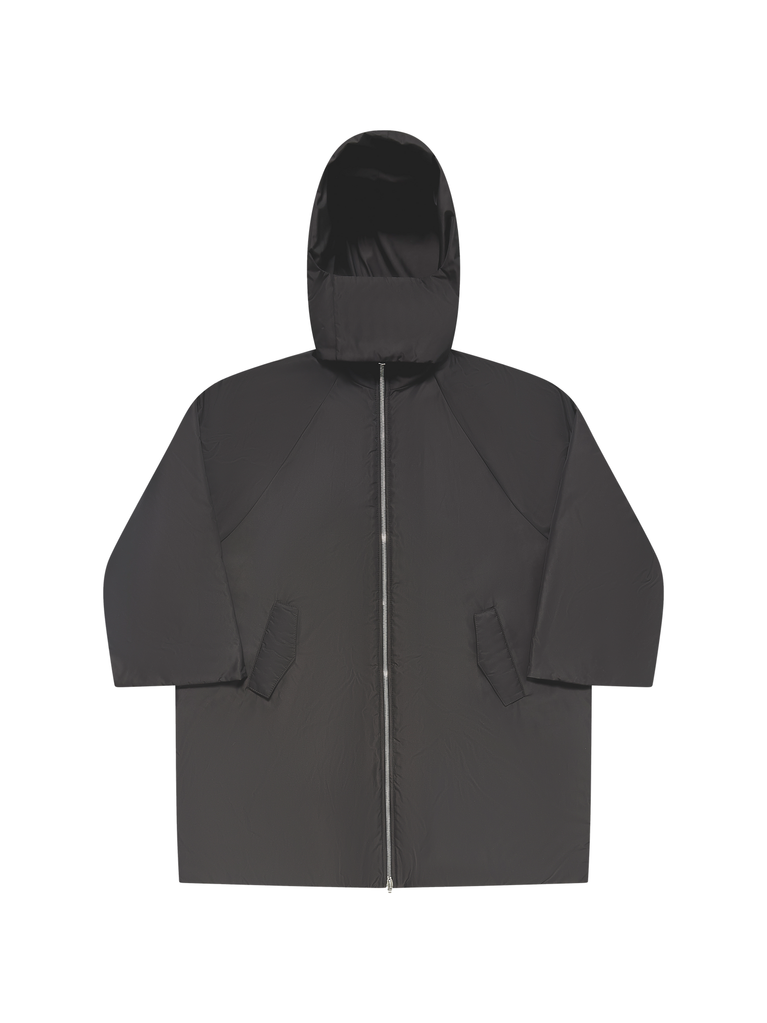 Oversized coat with exaggerated hood features RiRi zippers and kimono sleeves.